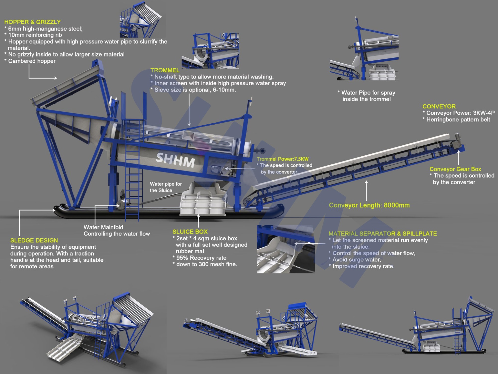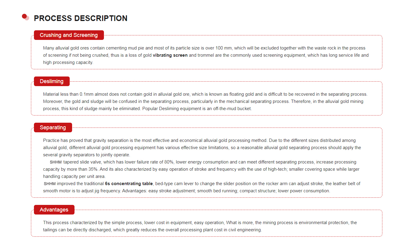 [Application]: Alluvial gold processing solution mainly applies to processing alluvial gold with a large volume of gangue minerals. Alluvial gold processing is a set of mining processes, including crushing and screening, desliming stage, separating stage,