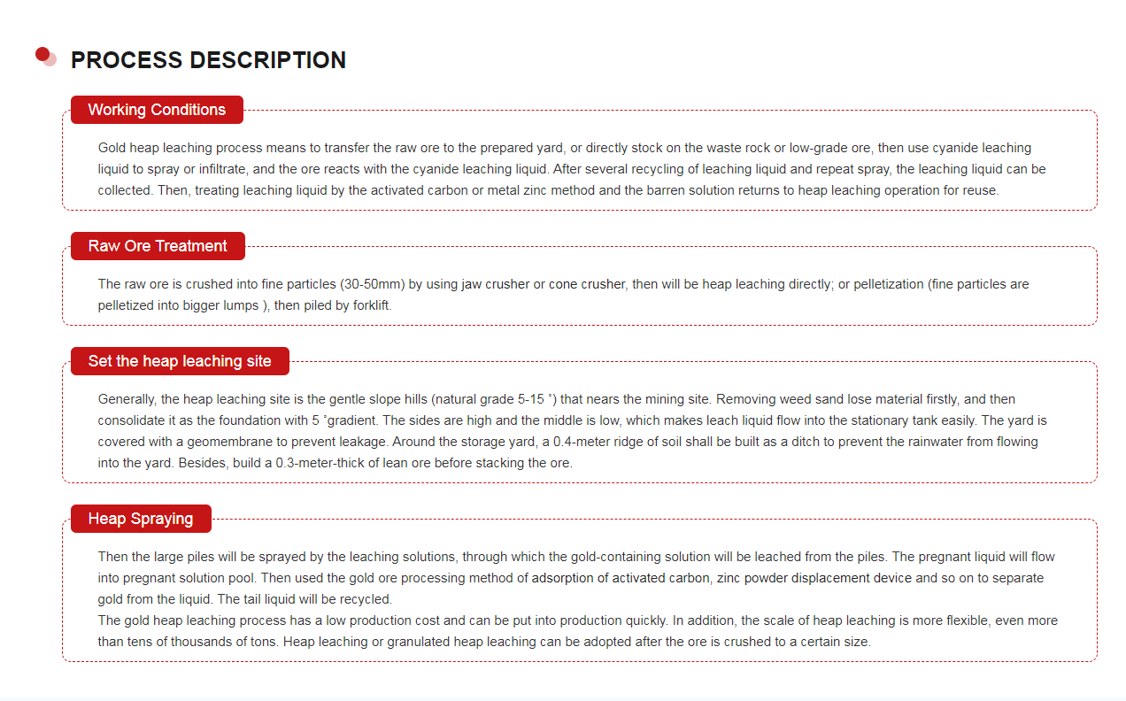 Heap leaching process is always used for low-grade ore, small gold mines, or both. These ores can not be processed by using the conventional gold ore processing method.